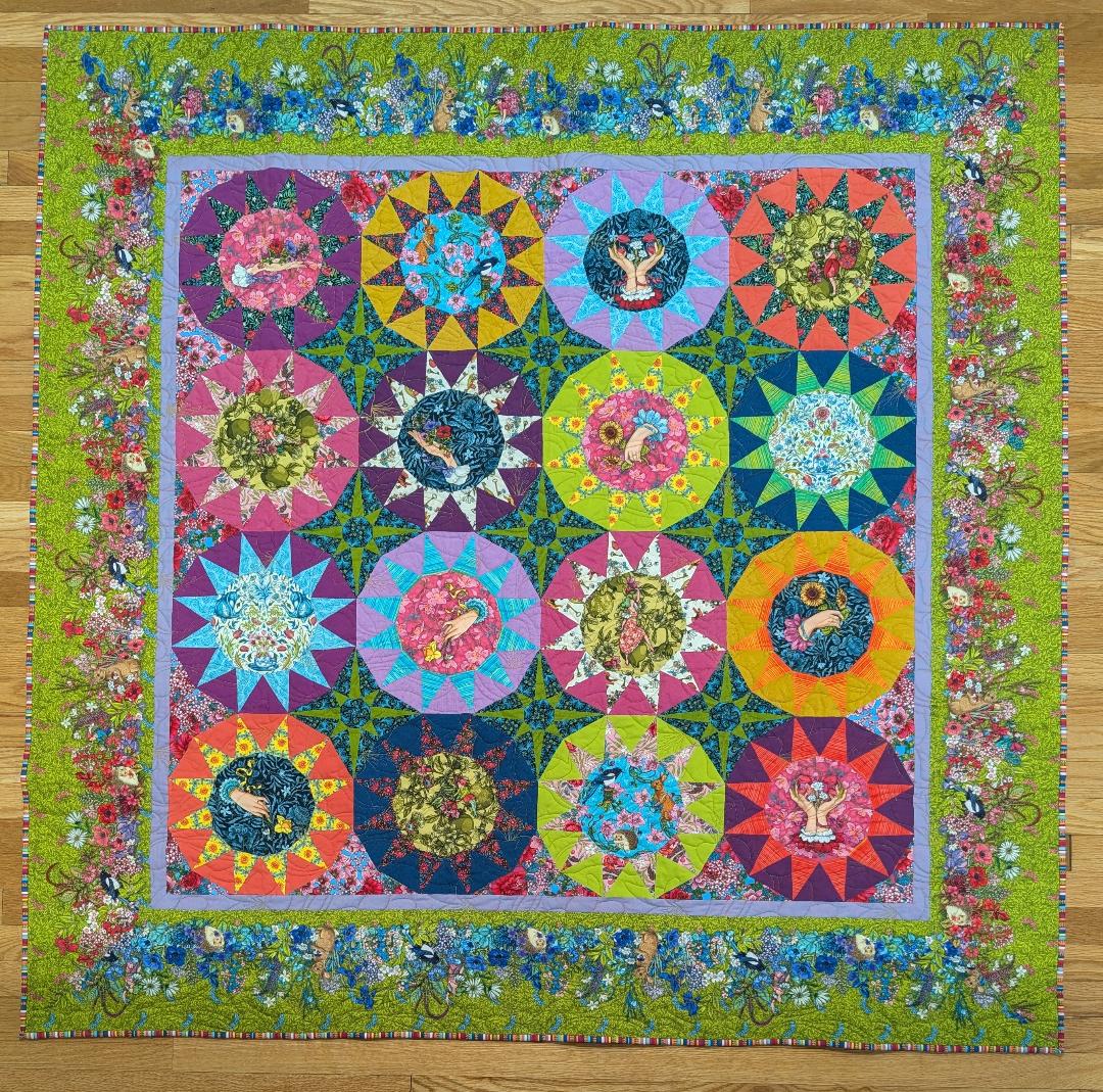 For her newest collection for Free Spirit, Odile Bailleoeul speak in the Language of Flowers. She "was interested in the language of flowers, which was once used by lovers to communicate their thoughts and emotions... The Victorian era was full of these delicate pictures and floral cards. The world of William Morris and Beatrix Potter were also ideal sources of inspiration for expressing the symbolism of the era: highly decorative compositions, animals serving as messengers, graceful hands expressing friendship, hope and benevolence. Isn’t this a wonderful way of communicating — through bouquets? So why not incorporate it into our quilts? You too can compose messages for those you love."