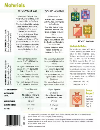 Who doesn't love showing off a beautiful finished quilt? Show and Tell is a celebration of that feeling! This patchwork quilt features foxes, bunnies, deer, and bears -- each holding up a different mini quilt. Make the 75" x 85" Large Quilt with 12 different blocks/quilts, or the 45" x 57" Small Quilt with 4 different blocks/quilts. The pattern also includes instructions for making a 24" x 28" mini quilt with a single block. Blocks are made with fat quarters and fat eighths. Refer to the pattern back for yardages. Solid and/or small, non-directional fabrics are recommended. This is a patchwork quilt pattern. (No templates or paper piecing are used.) The projects in this pattern include small pieces and are recommended for quilters familiar with rotary cutting and patchwork piecing.