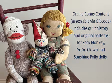 • QR code leads to free bonus content: quilt history and original patterns for Sock Monkey, Yo-Yo Clown, and Sunshine Polly Dolls