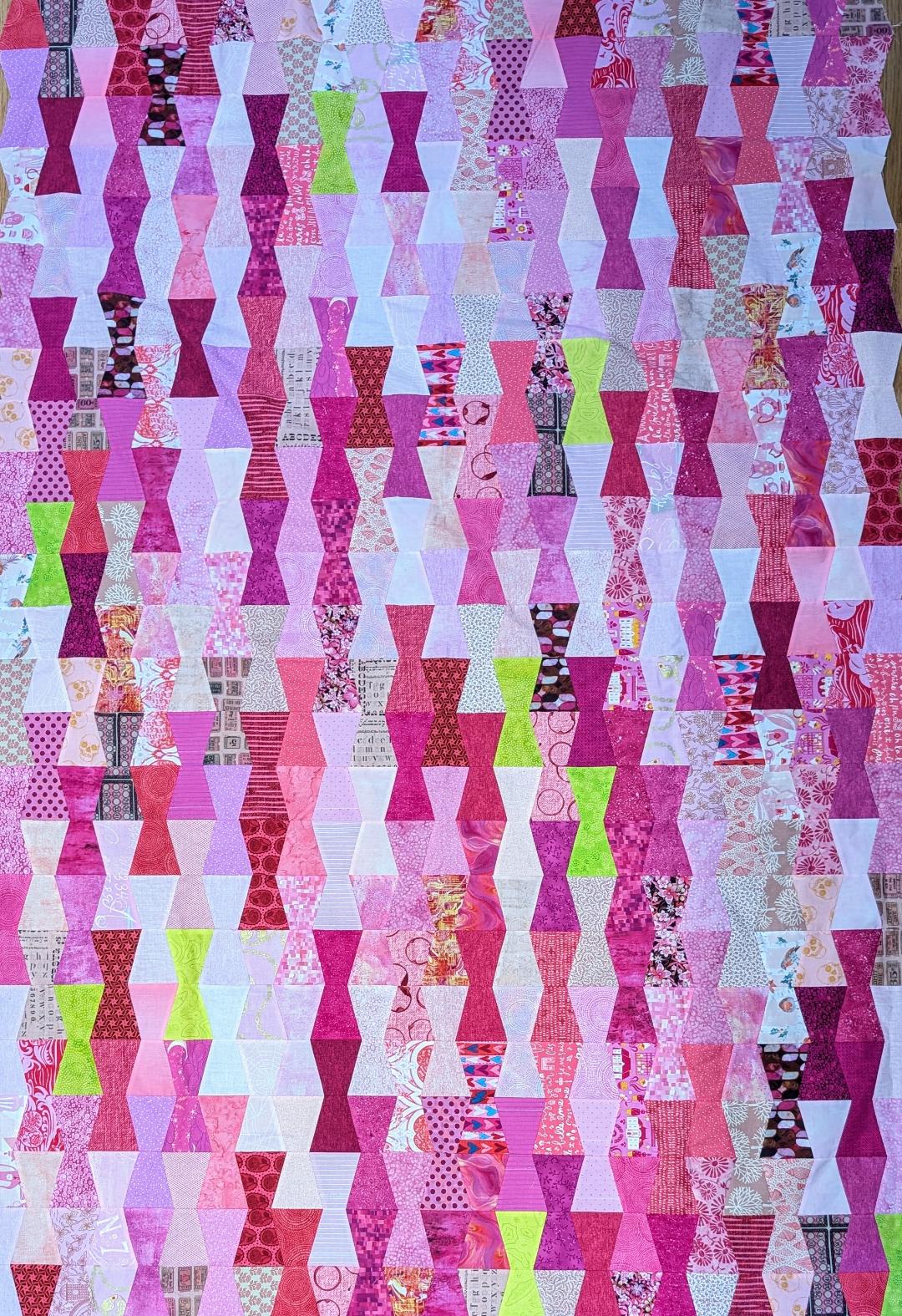 This quilt is made using pairs of tumbling blocks from a wide range of fabrics. The blocks are arranged with the narrowest edges touching and is often called the hourglass layout. We have carefully selected a wide range of pink hues for this fabric pack exclusively from Five Monkey Quilts made by Angie Lamoree. Make sure to watch her videos!