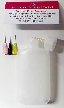 2 oz dispenser bottle dispenses precise application of liquids, glues, oils, and dyes. set of 4 metal hollow tips; 18,20,22, and 26 gauge