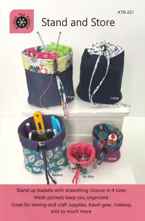 Adorable flat-bottomed baskets in 4 sizes for holding sewing and crafting supplies, makeup, baby gear & more. Interior mesh pockets on the small, medium and large sizes help keep things organized. Fold down drawstring sleeve for a cute contrasting band. Fold sleeve up to close with the drawstring for on-the-go storage. The medium and large sizes are a great place to start for confident beginners.