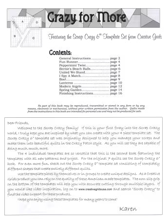 This book features nine more quilt projects you can make using the Creative Grids Scrap Crazy 6 template set (CGRMT6). The template set is the perfect way to use your scraps in the Crazy Patch style, but the templates also do much more. Learn to use the templates in alternate combinations to create unique projects.