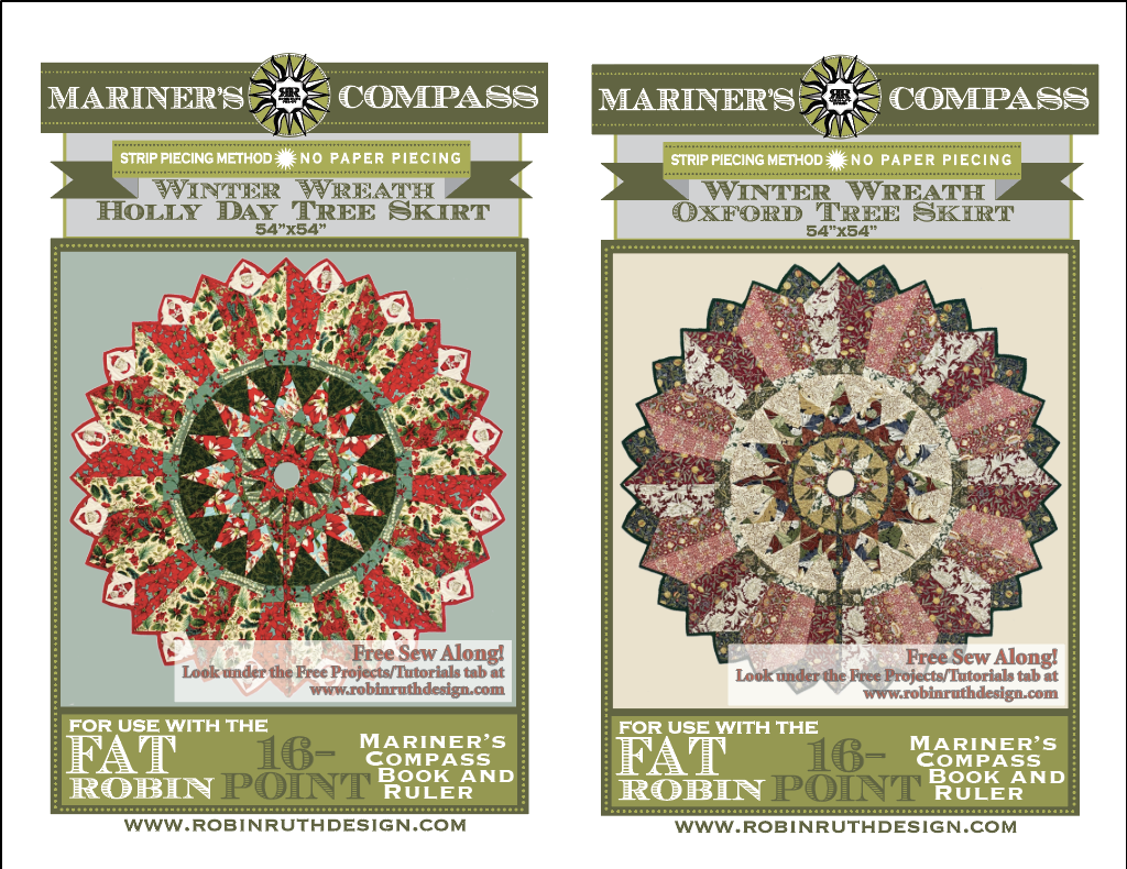 The finished tree skirt measures approximately 54”x54” and is made up of several different elements including a 12” Compass block nested inside of a 28” Round Sunflower block, a large Dresden band, and faced petals around the perimeter. The finished medallion is quilted onto a felt background, split on one side, bound around this split, and then the felt is trimmed around the perimeter to finish off the tree skirt. This project can also be finished into a 60”x60” quilt and the pattern has a design section where you can plan your own fabrics for either a tree skirt or a quilt!